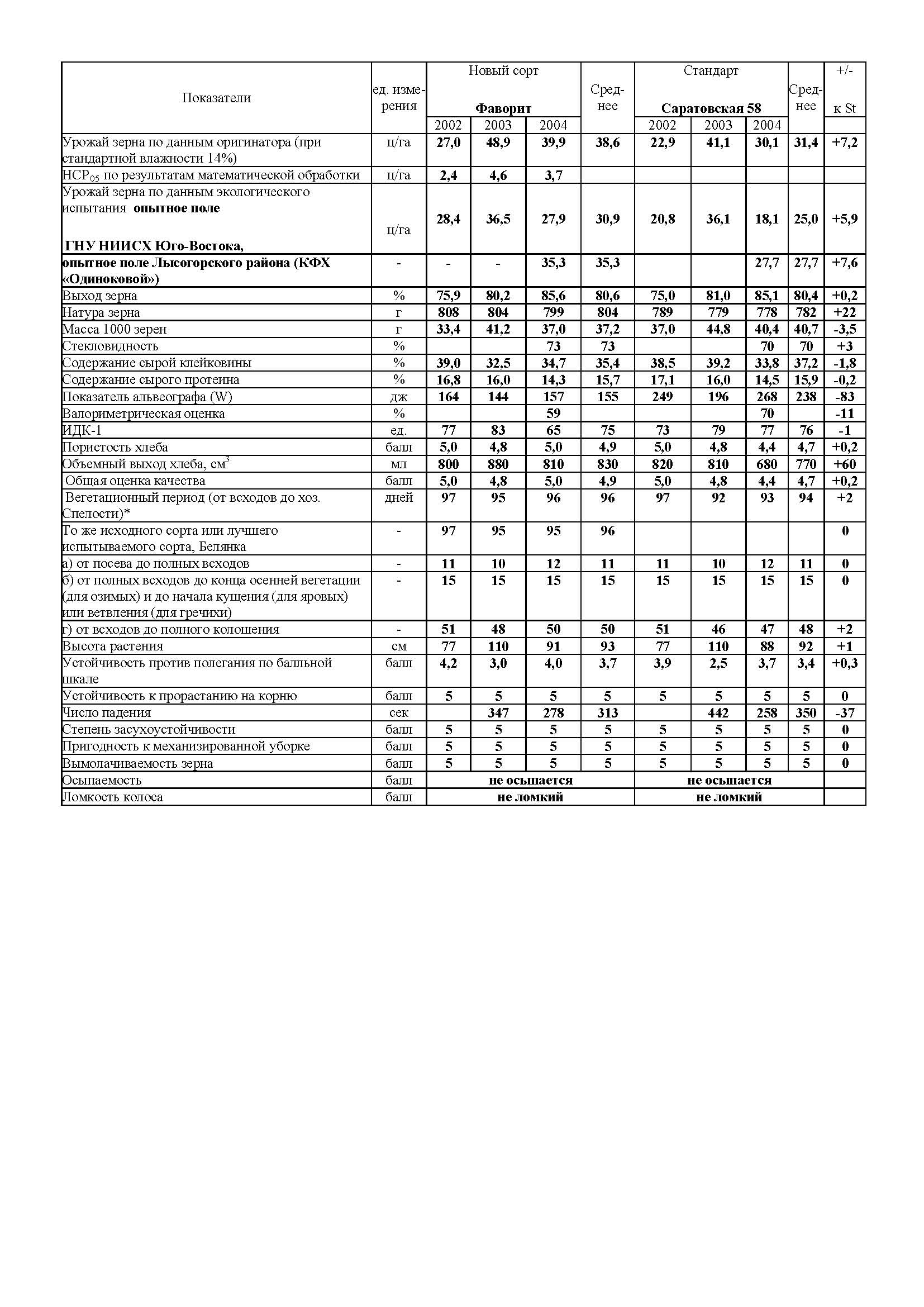 Сорт яровой мягкой пшеницы Фаворит создан в ГНУ Научно-исследовательском институте сельского хозяйства Юго-Востока. Авторы: д.б.н. С.Н. Сибикеев, В.А. Крупнов, к.б.н. С.А.Воронина, к. с.-х. н. А.Е. Дружин, Т.Д. Голубева, Т.В. Калинцева. Правовые параметры: Сорт находится под патентной охраной. Патент № 3547 от 4.04.2007 г. Сорт занесен в реестр с 2007 года по Нижневолжскому региону, с 2009 года районирован по Уральскому, Центрально-Черноземному и Средневолжскому региону. Родословная сорта и генетические особенности: Сорт получен путем сочетания в одном генотипе хозяйственно-ценных признаков от твердой пшеницы (от сортов Краснокутка 10 и Гизик), полбы (Вернал) с положительными признаками саратовских сортов яровой мягкой пшеницы, включая сорта Л503 и Белянка: Л2033 / Белянка. Он имеет хромосомное замещение 6D/6Agi. Ботаническая разновидность. Разновидность лютесценс: колос белый, неопушенный, с остевидными отростками на верхушке колоса, зерно красное. Колос цилиндрический, средней плотности, с восковым налетом. Лист зеленый, со слабым восковым налетом, опушение среднее. Зерно удлиненно-яйцевидное с длинным хохолком, бороздка средняя. Масса 1000 семян колеблется от 31 до 37 г, натура зерна 799 г/л. Биологические особенности. В среднем за 3 года сорт в основном конкурсном испытании (ОКИ) в Экспериментальном хозяйстве Института превысил стандарт Саратовскую 58 на 7,2 ц зерна с 1 га, при урожае 38,6 ц/га. По данным ОКИ, главная отличительная особенность сорта - стабильно (ежегодно) достоверно более высокий урожай зерна по отношению к стандарту (на 4,1- 9,8 ц/га). Наибольший урожай зерна сорт дал в благоприятном 2003 году - 48,9 ц/га, что свидетельствует о высокой потенциальной продуктивности сорта, которая сочетается с высокой устойчивостью к листовой ржавчине - ни при естественных эпифитотиях ни при искусственном инфицировании не наблюдалось пустул патогена, при этом тип реакции 0-0; против 20 -50 % поражения, при типе реакции 3-4 у Саратовской 58 и Саратовской 29, он также проявляет высокую устойчивость к мучнистой росе и пыльной головне. Большая, в сравнении со стандартом, продуктивность этого сорта в условиях эпифитотий листовой ржавчины и мучнистой росы подтверждается результатами экологического испытания на опытном поле ГНУ НИИСХ Юго-Востока, где урожай зерна и прибавка к стандарту у Фаворита составили соответственно 27,9 ц/га и 9,8 ц/га. Сорт в условиях Саратова созревает в среднем за 96 дней, что на 2 дня позже Саратовской 58. Фаворит при одинаковой со стандартом высоте растений (в среднем 93 см) имеет большую устойчивость к полеганию, что обеспечивает ему лучшую механизированную уборку. Фаворит превосходит стандарт по натуре (на 22 г) при практически одинаковым выходе зерна. Сорт устойчив к предуборочному прорастанию, что проявилось во влажных условиях уборки. Фаворит имеет число падения в среднем - 313 сек. Устойчивость к полеганию 3,7 балла. По данным лаборатории технологии зерна, Фаворит имеет хорошие технологические свойства зерна. В среднем содержание клейковины по сорту составило 35,4%, сырого протеина - 15,7%, сила муки - 155 е.а., валориметрическое число - 59%, качество клейковины - 75 ед. ИДК-1, объем хлеба - 830 мл, пористость мякиша - 4,9 балла. Сочетание большей в сравнении со стандартами продуктивности с высоким содержанием сырой клейковины и протеина - еще одна отличительная особенность нового