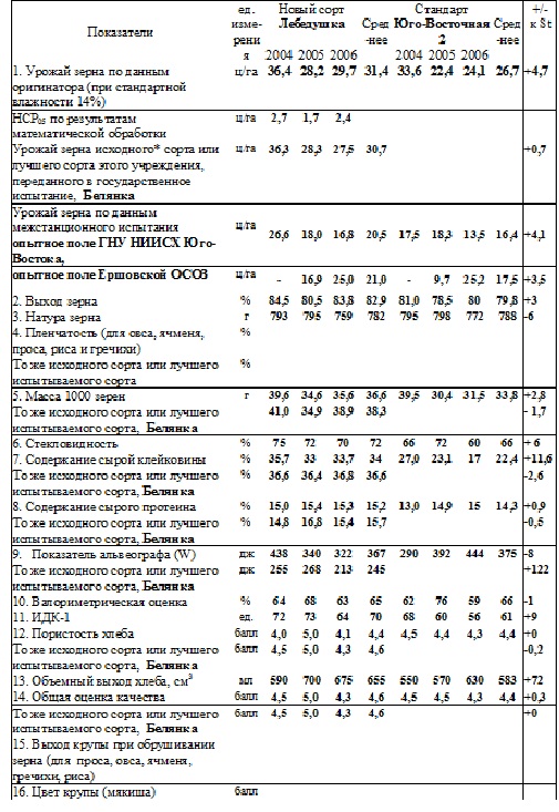 В среднем за 3 года (2004-2006) сорт в основном конкурсном испытании (ОКИ) в Экспериментальном хозяйстве Института превысил стандарт Юго-Восточная 2 на 4,7 ц зерна с 1 га, при урожае 31,4 ц/га. По данным ОКИ, главная отличительная особенность сорта - стабильно (ежегодно) достоверно более высокий урожай зерна по отношению к стандарту (на 2,8- 5,8 ц/га). Наибольший урожай зерна сорт дал в благоприятном 2004 году - 36,4 ц/га, в условиях эпифитотии листовой ржавчины и мучнистой росы, что свидетельствует о высокой потенциальной продуктивности сорта. Большая, в сравнении с сортом-стандартом (Юго-Восточная 2), продуктивность нового сорта Лебедушка подтверждается результатами межстанционных испытаний в 2004 - 2006 гг. на опытном поле ГНУ НИИСХ Юго-Востока, где урожай зерна и прибавка к стандарту у Лебедушки в среднем составила 4,1 ц/га. Испытания на Ершовской ОСОЗ в 2005 -2006 гг. показали преимущество нового сорта над Юго-Восточной 2 на 3,5 ц/га.