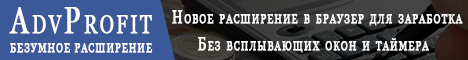 AdvProfit - лучшая реклама по доступной цене. Реклама не останется незамеченной Как известно человеку достаточно 6 секунд, чтобы воспринять информацию. Показ баннера засчитывается, только в том случае, если он был перед глазами у пользователя как минимум 15 секунд! Для того чтобы получать деньги за просмотр рекламы необходимо, установить наше расширение в свой браузер.