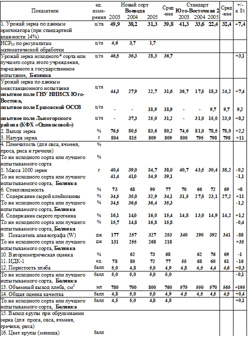 В среднем за 3 года (2003-2005) сорт в основном конкурсном испытании (ОКИ) в Экспериментальном хозяйстве Института превысил стандарт Юго-Восточная 2 на 7,4 ц зерна с 1 га, при урожае 39,8 ц/га. По данным ОКИ, главная отличительная особенность сорта - стабильно (ежегодно) достоверно более высокий урожай зерна по отношению к стандарту (на 4,6- 8,9 ц/га). Наибольший урожай зерна сорт дал в благоприятном 2003 году - 49,9 ц/га, в условиях эпифитотии листовой ржавчины и мучнистой росы, что свидетельствует о высокой потенциальной продуктивности сорта. Большая, в сравнении с сортом-стандартом (Юго-Восточная 2), продуктивность сорта Воевода подтверждается результатами межстанционных испытаний в 2003 - 2005 гг. на опытном поле ГНУ НИИСХ Юго-Востока, где урожай зерна и прибавка к стандарту у него в среднем составила 7,4 ц/га. На опытном поле Лысогорского района Саратовской области за 2004 - 2005 гг. средний урожай сорта Воевода составил 31,2 ц/га против 23,0 ц/га у Юго-Восточной 2. Испытания на Ершовской ОСОЗ в 2005 г. показали преимущество нового сорта над Юго-Восточной 2 на 9,2 ц/га. Сорт устойчив к предуборочному прорастанию, что проявилось во влажных условиях уборки 2003 и 2004 гг. Сорт высокоустойчив к листовой ржавчине - ни при естественных эпифитотиях, ни при искусственном инфицировании не наблюдалось пустул патогена, при этом тип реакции 0-0; против 10 -50 % поражения, при типе реакции 3 у Юго-Восточной 2 и 50 - 80% и типе реакции 3-4 у Саратовской 29. Кроме того, на высоком инфекционном фоне желтой ржавчины, на опытном поле Лысогорского района Саратовской области Воевода показал устойчивость к этому патогену в 2004 и 2005 гг. Воевода не поражается в отличие от Юго-Восточной 2 мучнистой росой и устойчив к почернению зародыша. По данным лаборатории технологии зерна Института, Воевода имеет хорошие технологические свойства зерна. В среднем за 2003-2005 гг. содержание сырой клейковины по сорту составило 34,1%, что на 6,9% выше чем у стандарта. Содержание сырого протеина за те же годы - 15,4%, против 14,2% у Юго-Восточной 2. У Воеводы сила муки - 253 е.а., валориметрическое число - 67%, качество клейковины - 77 ед. ИДК-1, объем хлеба - 760 мл, пористость мякиша - 4,9 балла. Сочетание большей в сравнении со стандартами продуктивности с высоким содержанием сырой клейковины и белка в зерне - еще одна отличительная особенность сорта Воевода.